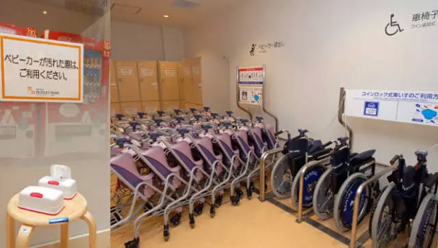 ↑為帶孩子和身體狀況不佳的顧客準(zhǔn)備的嬰兒車和輪椅設(shè)置于大門的入口附近,下車即可利用,最大限地減輕特殊顧客的體力負(fù)擔(dān)。旁邊放著消毒紙巾,用于擦拭嬰兒車。